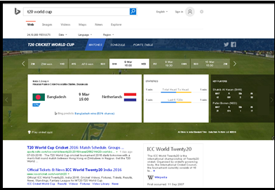 New Delhi, March 14, 2016: With the onset of the T20 Cricket season in India, Bing has announced a refreshed set of Cricket oriented search features such as Bing predictions, polls and quizzes designed to give Cricket lovers an enriched search experience. Bing brings to users an application integrated into Bing search that will provide comprehensive Cricket content such as live score, news, videos, photo, stats, previews, commentaries, etc. The search engine will also provide information on history of Cricket, the records held by cricketers etc.
