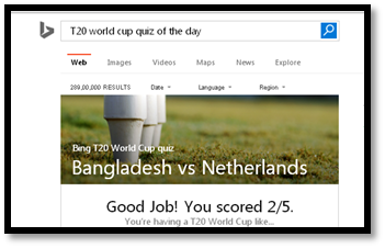 To add more fun and excitement to this Cricket season, Bing offers users the opportunity to play a daily cricket quiz to test their skills and voice their thoughts in the daily poll. Additionally, it also gives a reason behind very correct answer followed by a score allowing Cricket lovers to enhance their knowledge about the sport’s history. Users can share their score card via Facebook and Twitter and can challenge their family/friends to take up the quick cricket quiz.