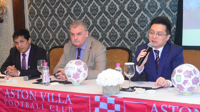 Aston Villa chairman (r) Tony Xia addresses the media in New Delhi announcing the launch of its Academy