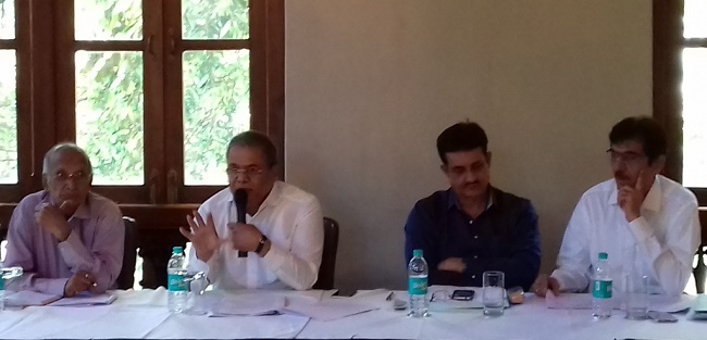 Mr. Arun Lakhani, President, Maharashtra Badminton Association (second from left) along with Mr. Pradeep Gandhe, Senior VP, MBA (second from right), Mr. Kulin Manek, Treasurer, MBA (first from right) and Mr. S. A. Shetty, Secretary, MBA (first from left) addressing audience at MBA’s 75th AGM in Mumbai