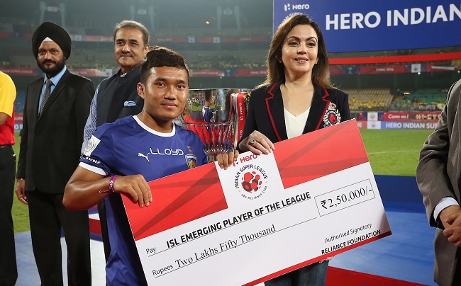 Jerry Lalrinzuala of Chennaiyin FC receives the ISL Emerging Player of the League Award from Nita Ambani Founder & Chairperson of Football Sports Development during the penalty shoot out of the Final of the Indian Super League (ISL) season 3 between Kerala Blasters FC and Atletico de Kolkata held at the Jawaharlal Nehru Stadium in Kochi, India on the 18th December 2016.