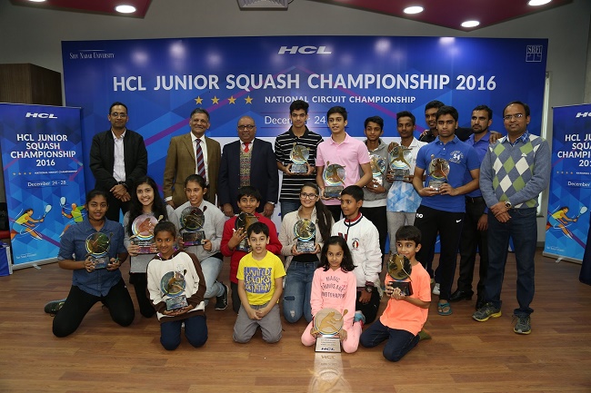 28 December, 2016, Great Noida, India: HCL, a leading global conglomerate, today announced the successful completion of its first ever HCL Junior Squash Championship, which was one of the highest level tournaments in the country. The winners were felicitated by Mr. Rajiv Swarup, President, Shiv Nadar University and Col. Gopal Karunakaran, CEO, Shiv Nadar Schools with a total prize purse of Rs. 5,00,000/- across all categories. The championship which kick-started on 24th December was held at Shiv Nadar University, Greater Noida.