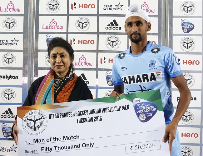 Lucknow, 8th December 2016: Following an energetic and colourful opening ceremony, India and Canada took to the field to contest the final match of the day. India delighted the noisy home fans with a high quality performance, winning 4-0 thanks to goals from Mandeep Singh, Harmanpreet Singh, Varun Kumar and Ajit Panday all on target. The Canadians were resilient in the first half, but India took control of the second and were deserving winners. Mandeep Singh won the Man of the Match award.
