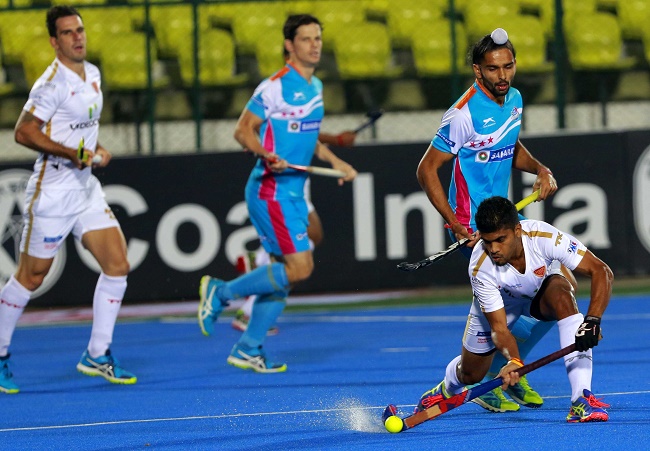 It was total entertainment with the two teams matching each other’s game, keeping the spectators at the Major Dhyan Chand Stadium riveted from hooter to hooter. First, it was Uttar Pradesh Wizards’ Ajay Yadav, who was also India’s U-17 Asia Cup winning captain, to fetch a 2-0 lead for the home team in the 12th minute. He was assisted by the experienced VR Raghunath who did well to find Yadav. The youngster was impeccable with a powerful shot that beat Dabang Mumbai’s experienced keeper David Harte. Dabang Mumbai, made up almost immediately, when Gurjant Singh popular for his back hander struck in the 13th minute to equalise. It was his teammate Manpreet from the Junior World Cup winning team who did extremely well to dribble past Raghunath and Gonzalo Peillat in the circle to find Gurjant who simply had to tap the ball into the post.