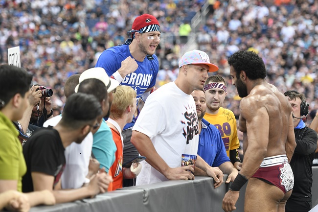An unimpressed Mahal then drew the ire of Gronk by splashing him with a cup of water. The NFL tight end invaded the ring moments later, then proceeded to settle the score with Mahal by leveling him with a pro bowl-caliber shoulder block. Gronk’s arrival left the remaining superstars confused, which allowed Rawley to capitalize. He promptly eliminated the lone NXT entrant, then finished Mahal’s night to become the last man standing in the biggest bout at the ultimate thrill ride.